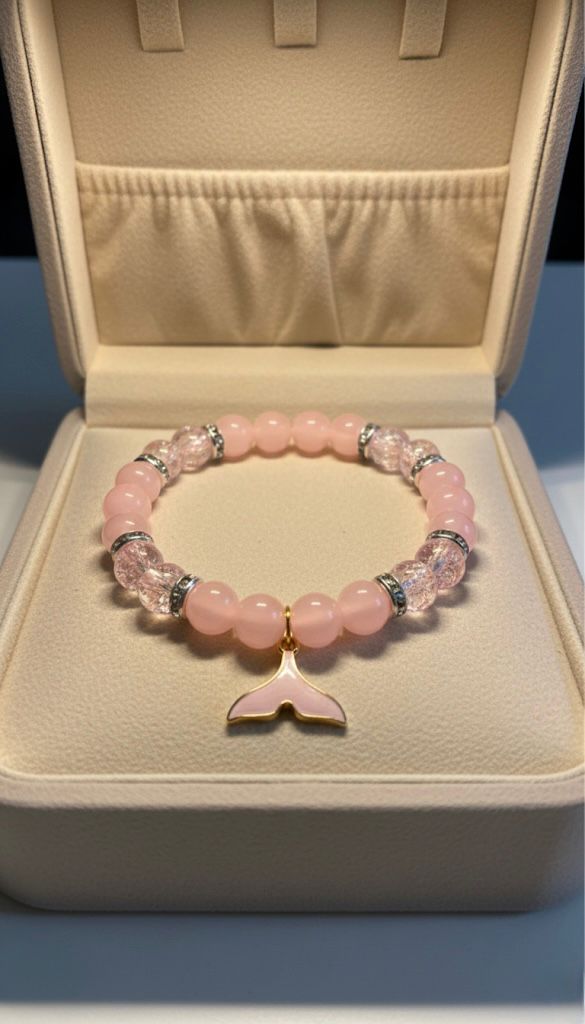 A soft pink beauty made with glossy beads and sparkly crackle accents, finished with a dreamy mermaid tail charm. Sweet, elegant, and perfect for a gentle, girly look. 💗✨