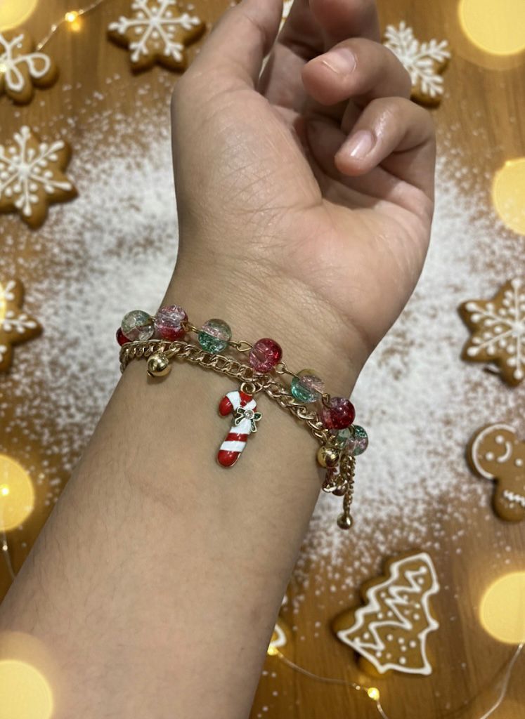 A festive charm bracelet designed with sparkling red, green, and crystal beads, paired with golden jingle bells and a cute candy cane charm. Perfect for adding holiday sparkle and cheerful Christmas vibes to your look! ❤️💚✨
